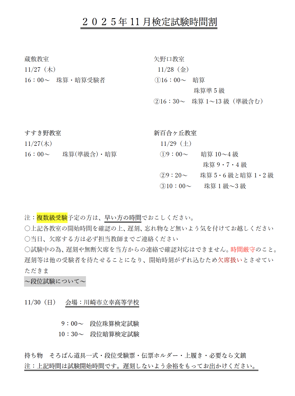 2025年11月検定試験時間割