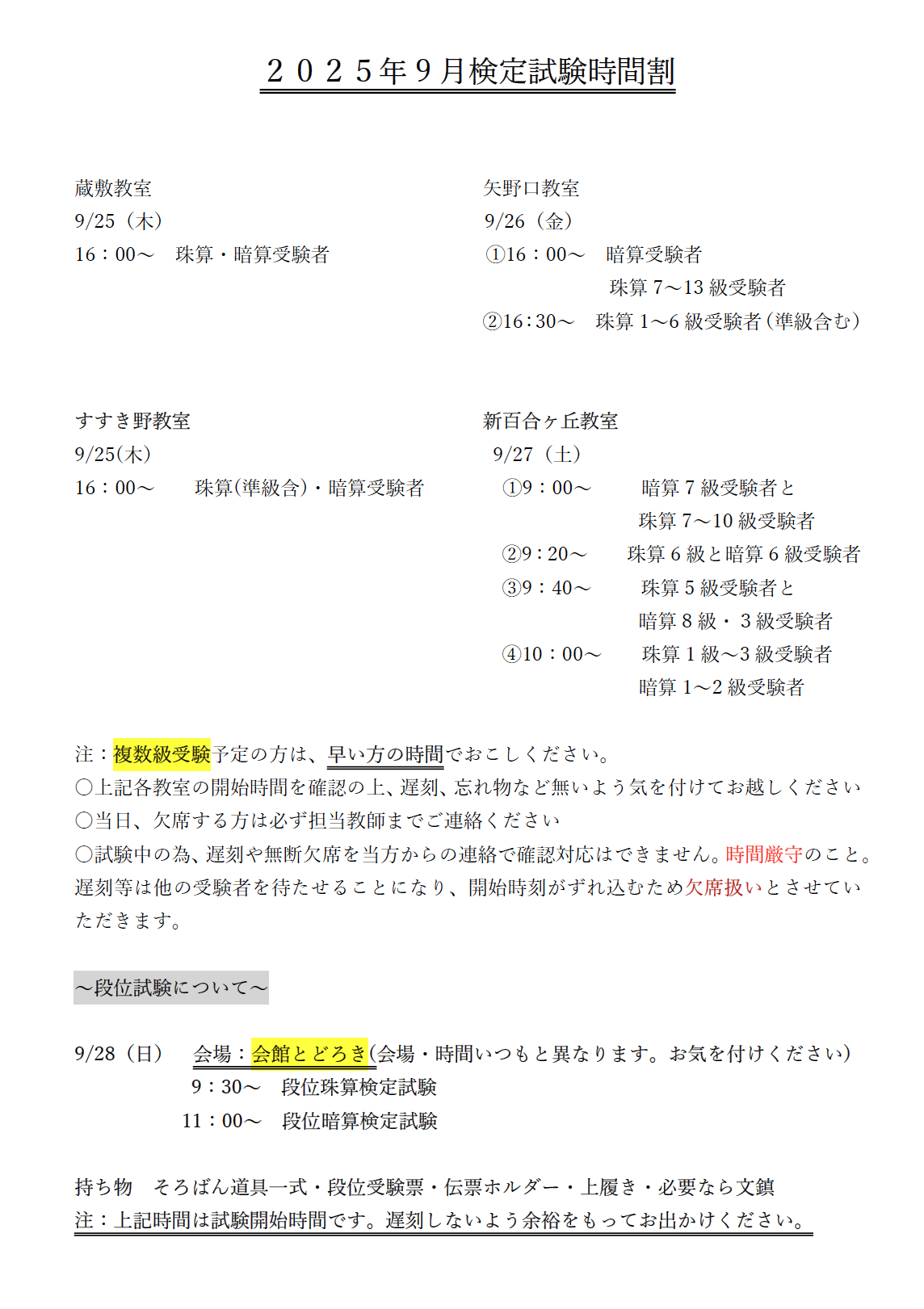2025年9月検定試験時間割